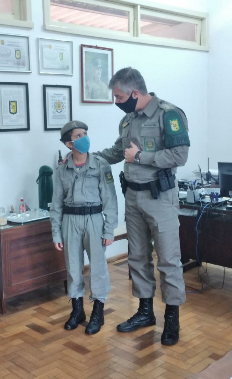 Em contato com o pai do menino, ele relatou que o pequeno admira a Instituição e sonha em ser policial militar. Na oportunidade foi realizada a entrega de donativos à família, que foram arrecadados em ação solidária pelo efetivo do (35º BPM) e, além disso, foi confeccionada e entregue uma farda mirim a criança.