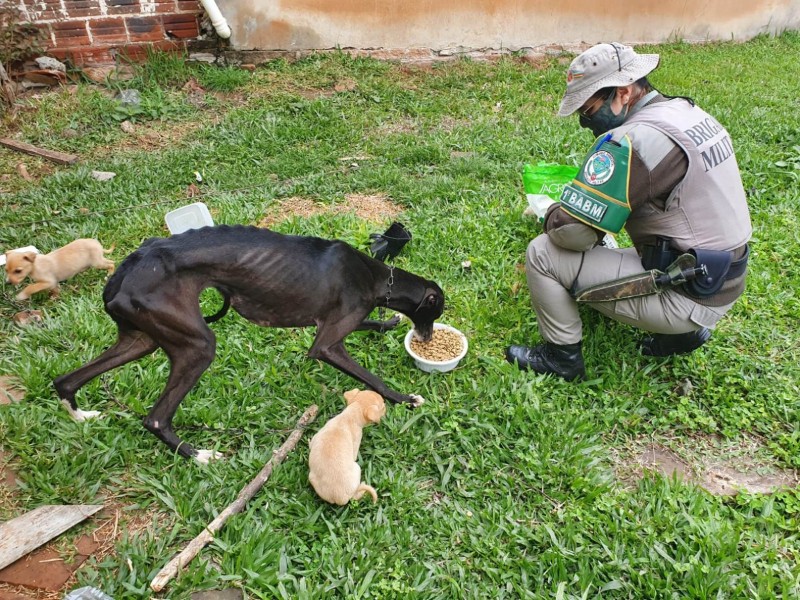 Diante da situação, a guarnição providenciou 5 kg de ração e solicitou a um vizinho para ir tratando o animal, até o responsável retornar para casa.