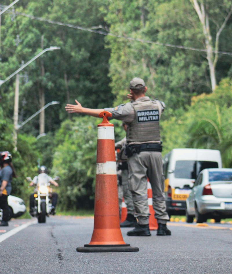 Policial Militar de costas, realizando movimento indicando ordem de parada para uma motocicleta.